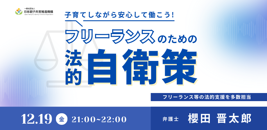 12月19日(金)にオンラインで実施された本セミナーでは、日本親子共育推進機構 顧問弁護士・櫻田晋太郎氏を講師に迎え、2024年11月施行のフリーランス保護法を中心に、親としてフリーランスとして安心して働き続けるための法的知識を学びました。