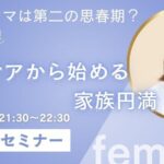 2025年10月3日 / 最終更新日時 : 2025年12月2日 oyakokyoiku 活動 本機構主催のセミナー「40代パパママは第2の思春期?誰でも簡単!フェムケアから始める家族円満」を開催しました 10月2日(木)にオンラインで実施された本セミナーでは、フェムテック専門家・フェム姉うさこ氏を講師に迎え、更年期に起こる体の変化と、夫婦で実践できるセルフケア法を学びました。「男性にもフェムケアが必要と知って驚いた」「骨 […]